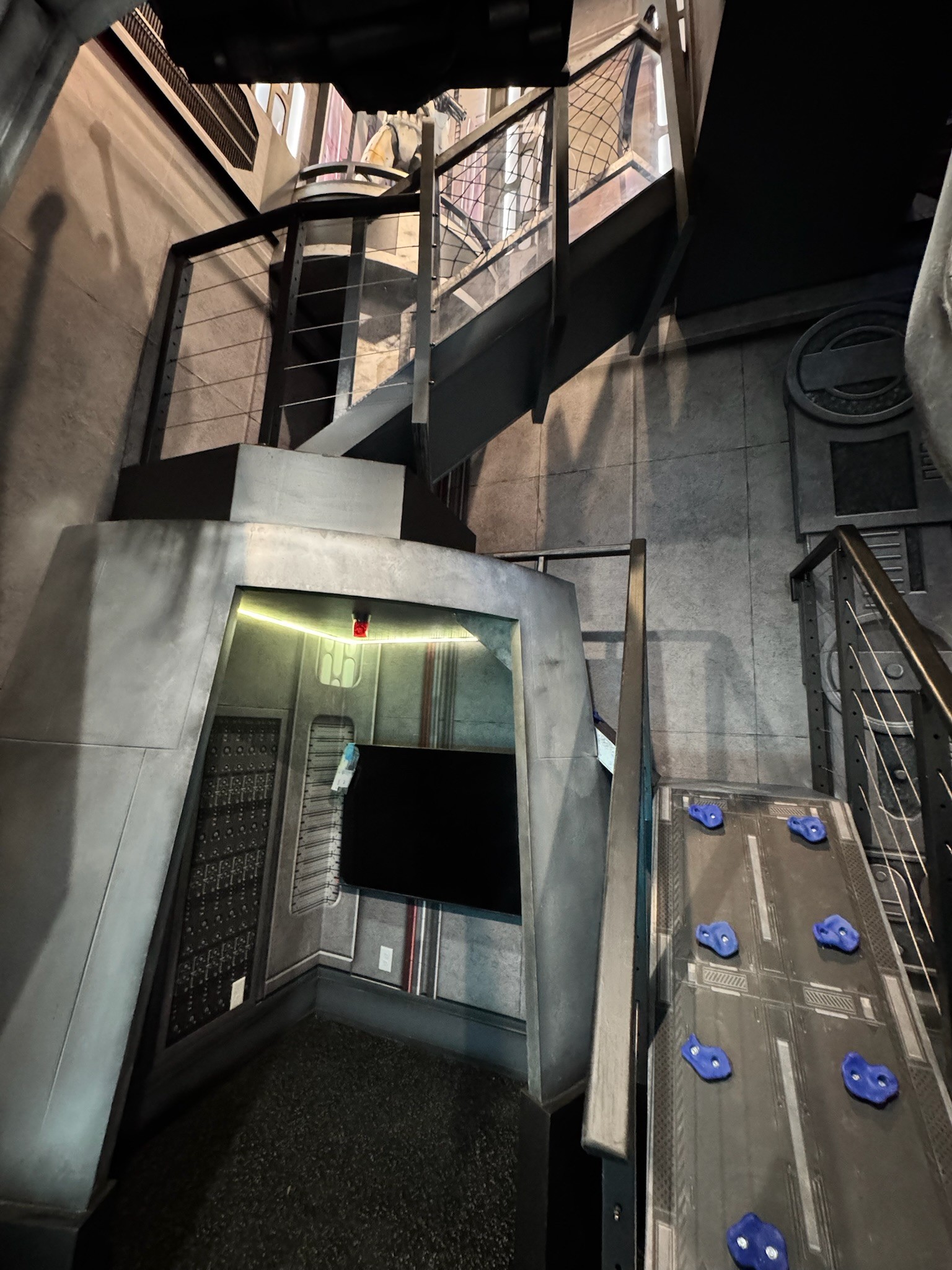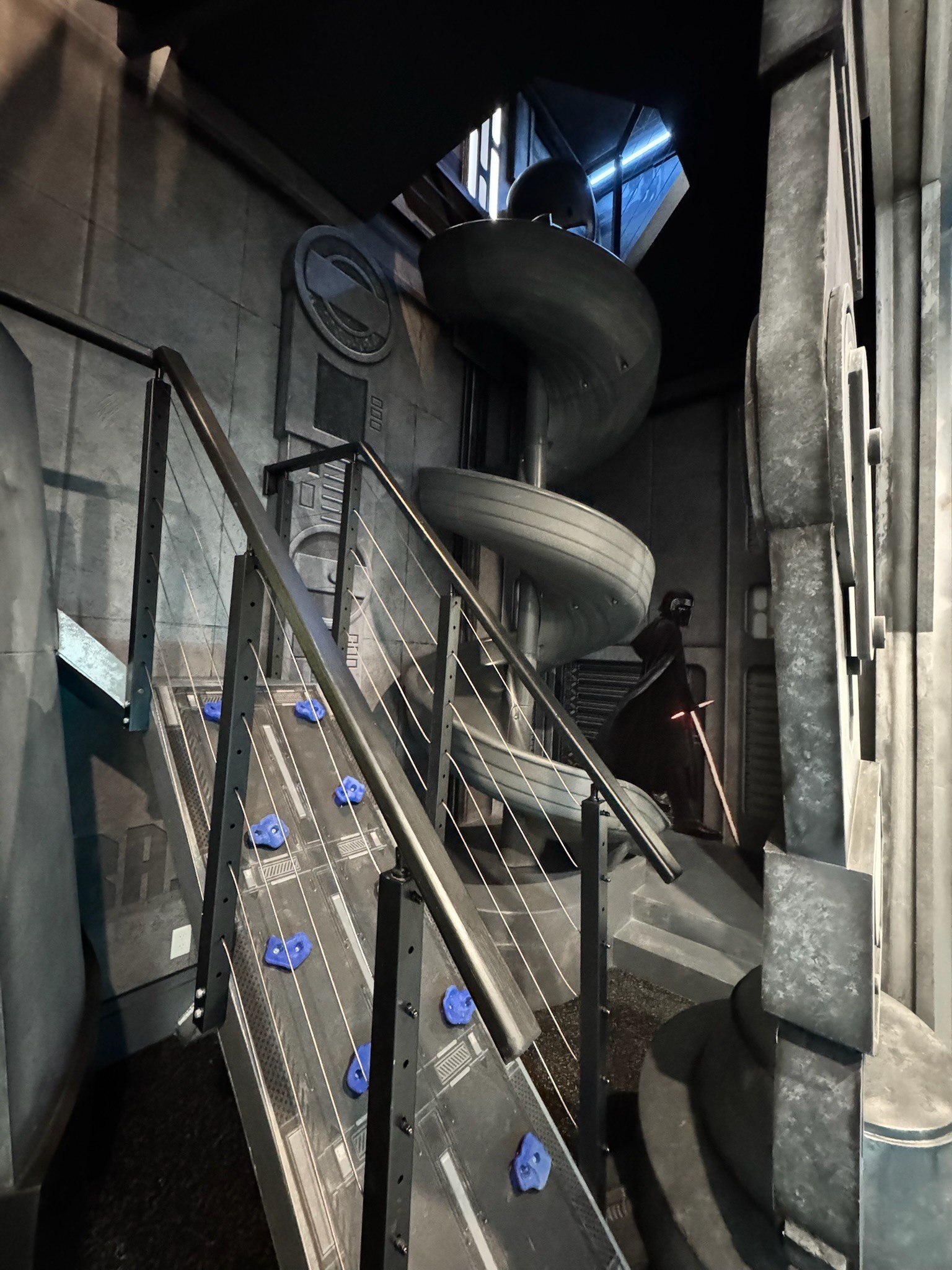 Inside the house, we focused on creating memorable themed rooms, starting with the two-story Star Wars Bedroom. The Imperial Room draws inspiration from Star Wars, complete with bunk beds in the imperial barracks and a hidden playroom. Young adventurers can climb rock walls, pass a towering stormtrooper, and enter the AT-Walker command center—only to escape via a two-story spiraling slide down to the base, where gaming consoles await their next mission.