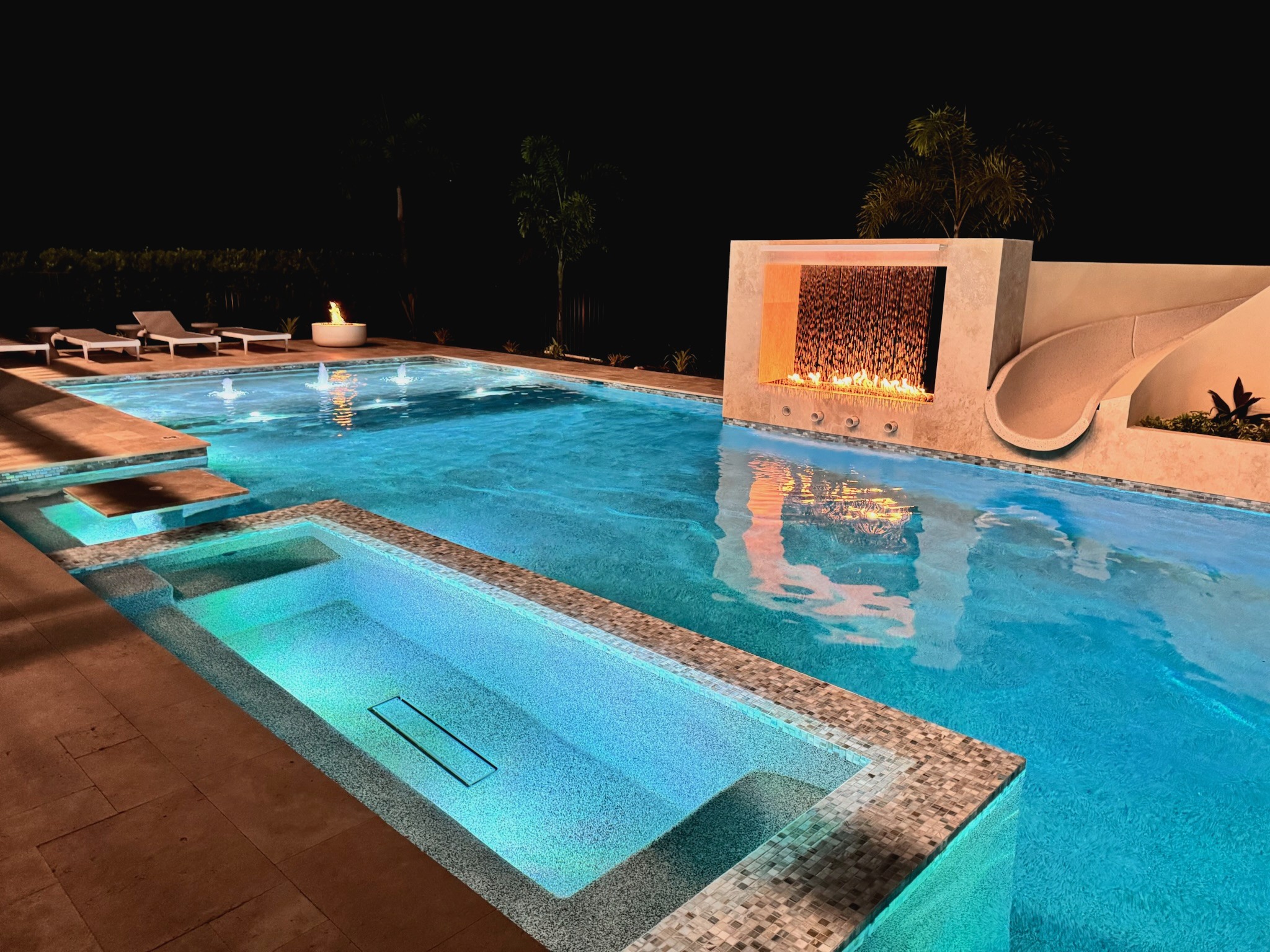 Planning Wondara Retreat began with designing the ultimate pool. Since a large pool tops nearly every renter's wish list, we went big—55 feet long, 20 feet wide, and 6 feet deep. We wanted a modern look, steering away from the typical faux-rock slides. Enter a top pool company, who brought our vision to life with a sleek, architectural design. The pool includes a hidden grotto with a rain sheer and secret exit, LED-lit steps leading to the slide, and a stunning fireplace behind a second rain sheer for evening ambiance. Guests can unwind in the oversized hot tub, relax at the water table, or soak on water loungers beside lighted fountains. The pool also includes a basketball hoop, a firepit for cool evenings, and thoughtful touches for both fun and relaxation.